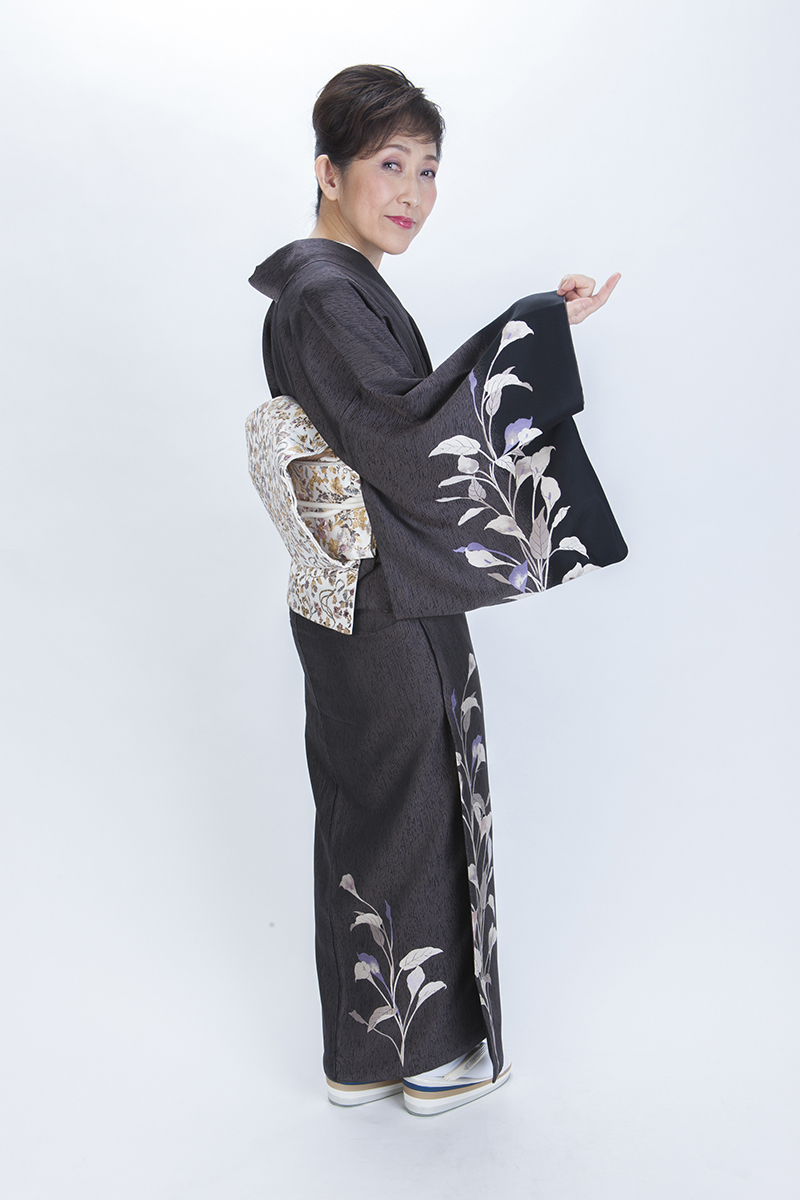 唐織の訪問着は、左側の肩から裾にわたる花のラインが好きです。大柄の着物なので、小柄の花の加納幸さんの緞子の帯にしました。