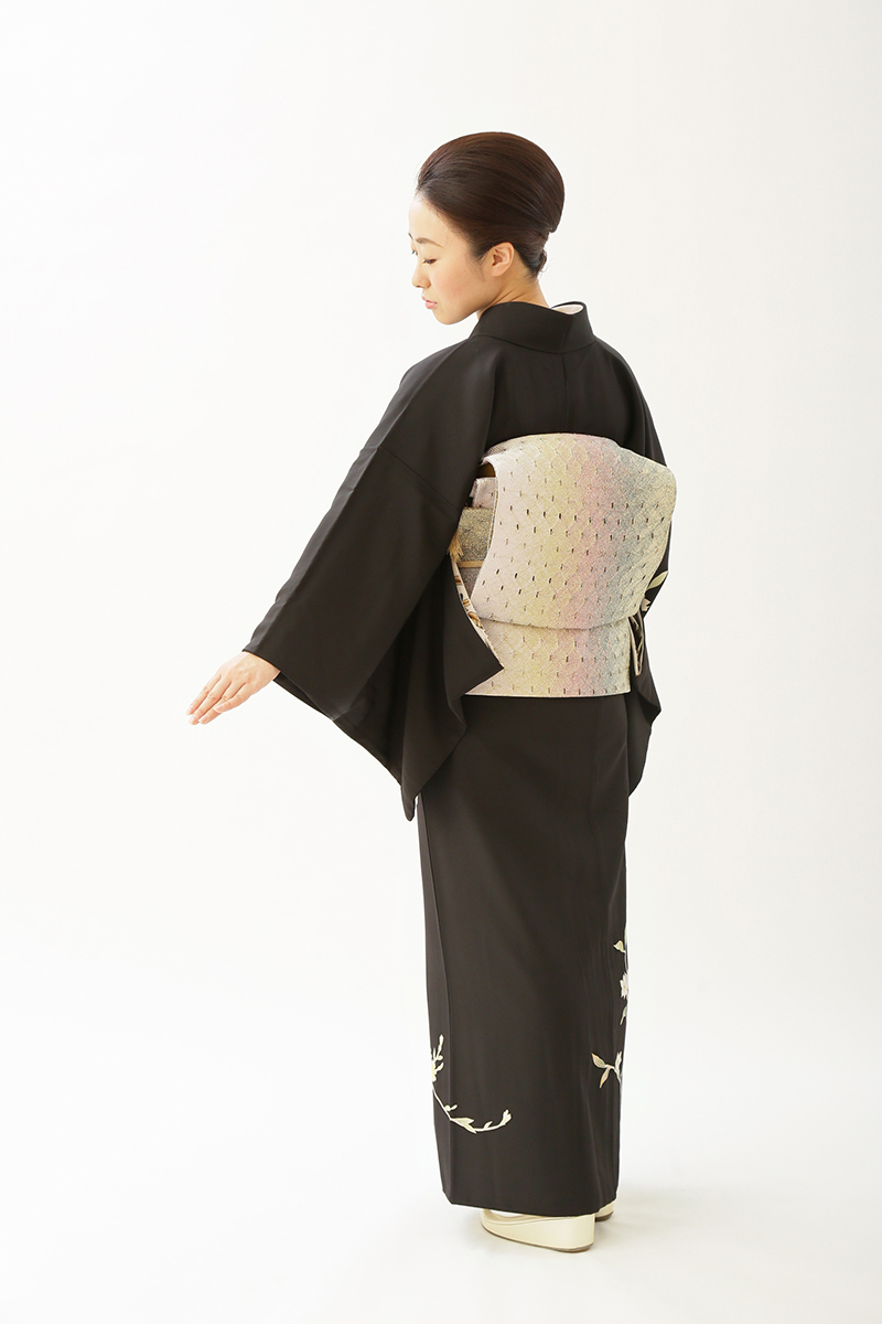 本加賀友禅:今日は黒の気分。お花の配色がお気に入り。帯:組み帯、長襦袢:岡重さんのベージュのにわとり。