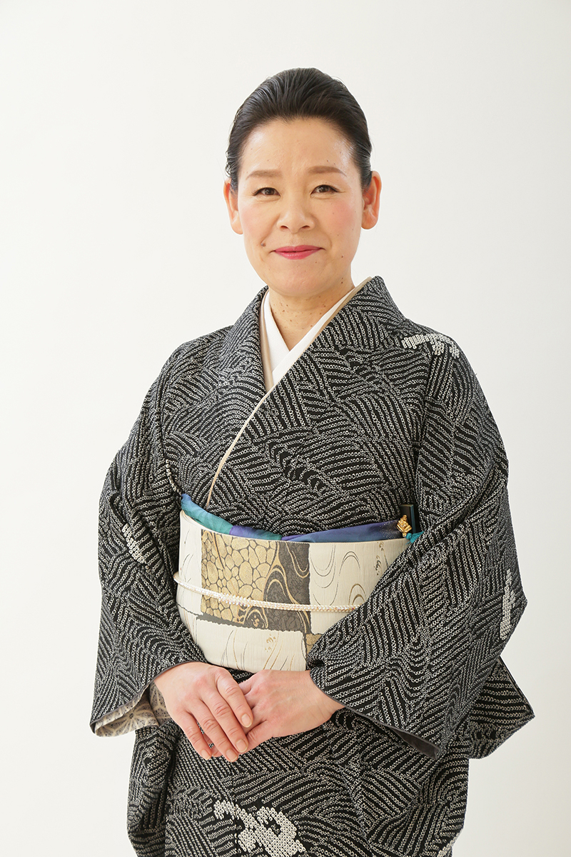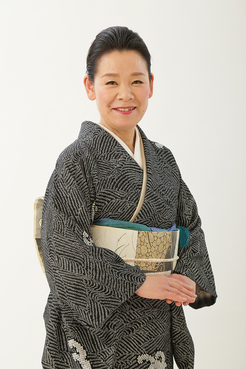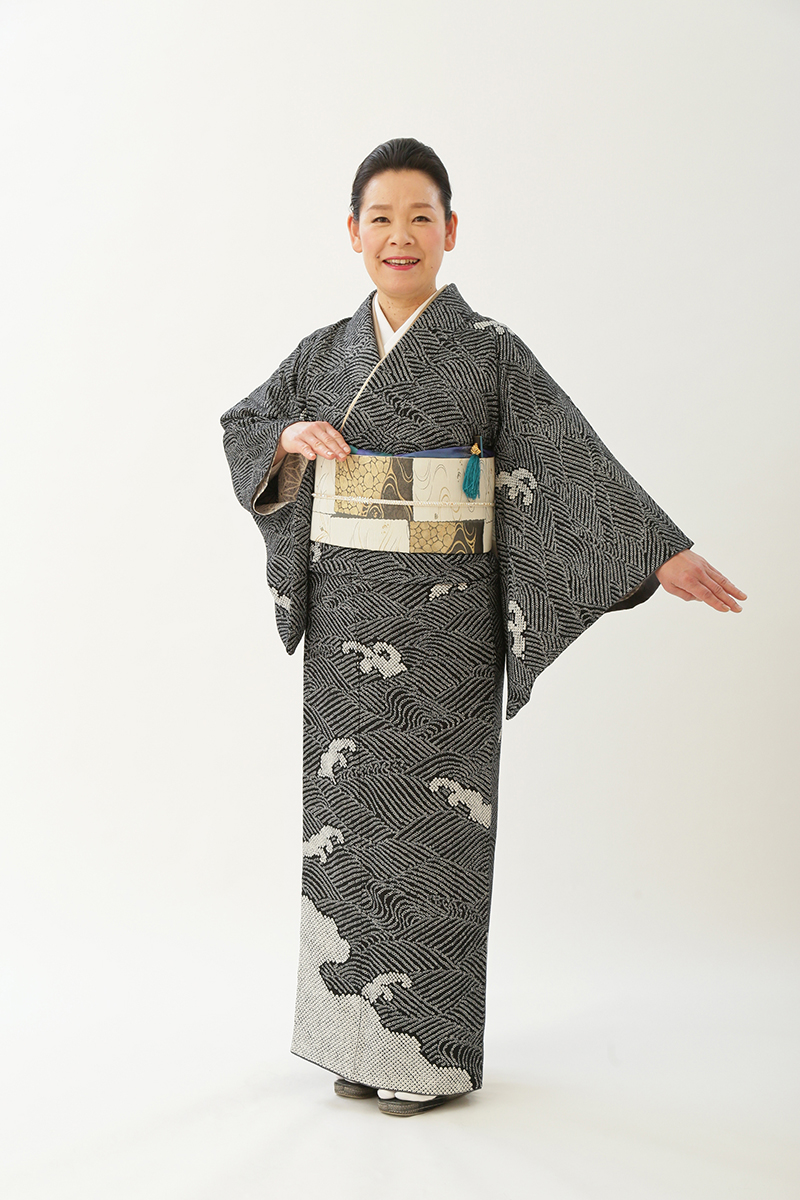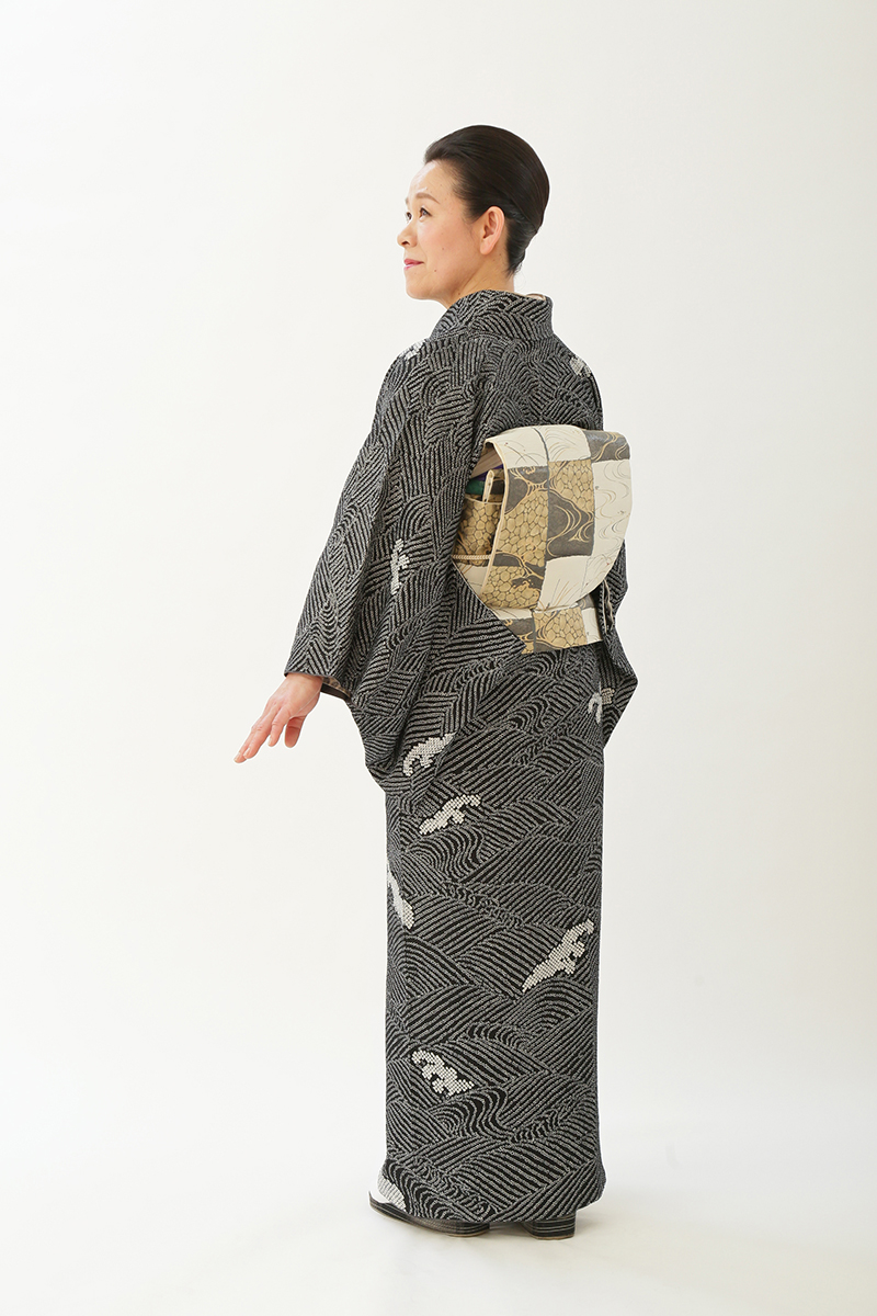 黒白の総絞りの訪問着、山本陽子デザイン帯(経済産業大臣賞を取った)、ターコイズブルーの帯揚げでアクセント、スワロフスキーの帯締めで華やかさを出しています。草履:JOTAROさんのもの。長襦袢:麻の杢グレーも楽しんでいます(周りから着物みたいで素敵と言われます)